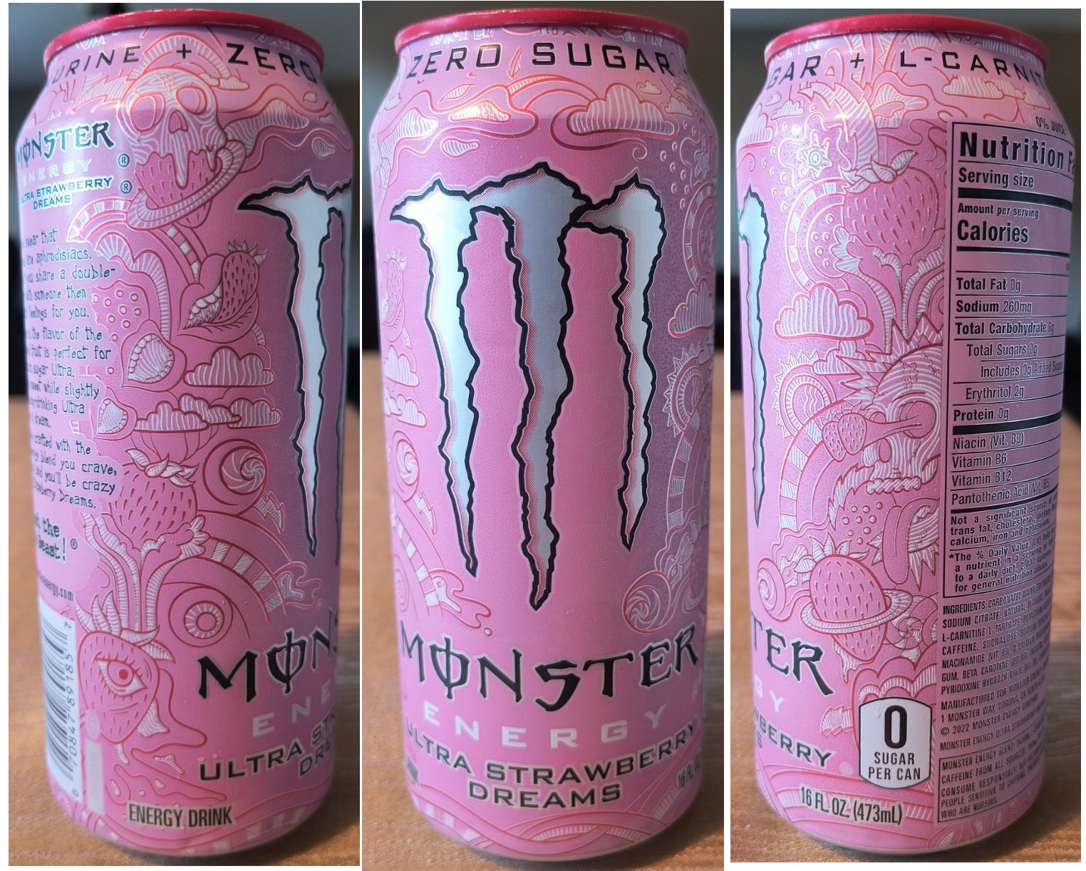 This is the art on the can of the Monster Ultra Strawberry Dreams. Monster has some of the most unique art on their can. This one features strawberries and skulls. The art is slightly textured on the can, giving it a premium feel.